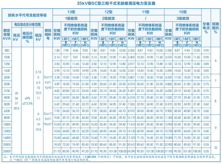 電壓等級(jí)35kV,變壓器容量30~20000kVA,該變壓器是我公司在消化吸收引進(jìn)技術(shù)的基礎(chǔ)上硏制開發(fā)的35kV級(jí)絕緣干式變壓器,產(chǎn)品的設(shè)計(jì)與制造均滿足IEC60076.GB1094.GB/T10228等標(biāo)準(zhǔn)的要求,產(chǎn)品將35kV電網(wǎng)電源直接降低為400V配電電源或10kV輸電電源為用戶供電。具有顯著優(yōu)點(diǎn),為越來越多的工程所采用。